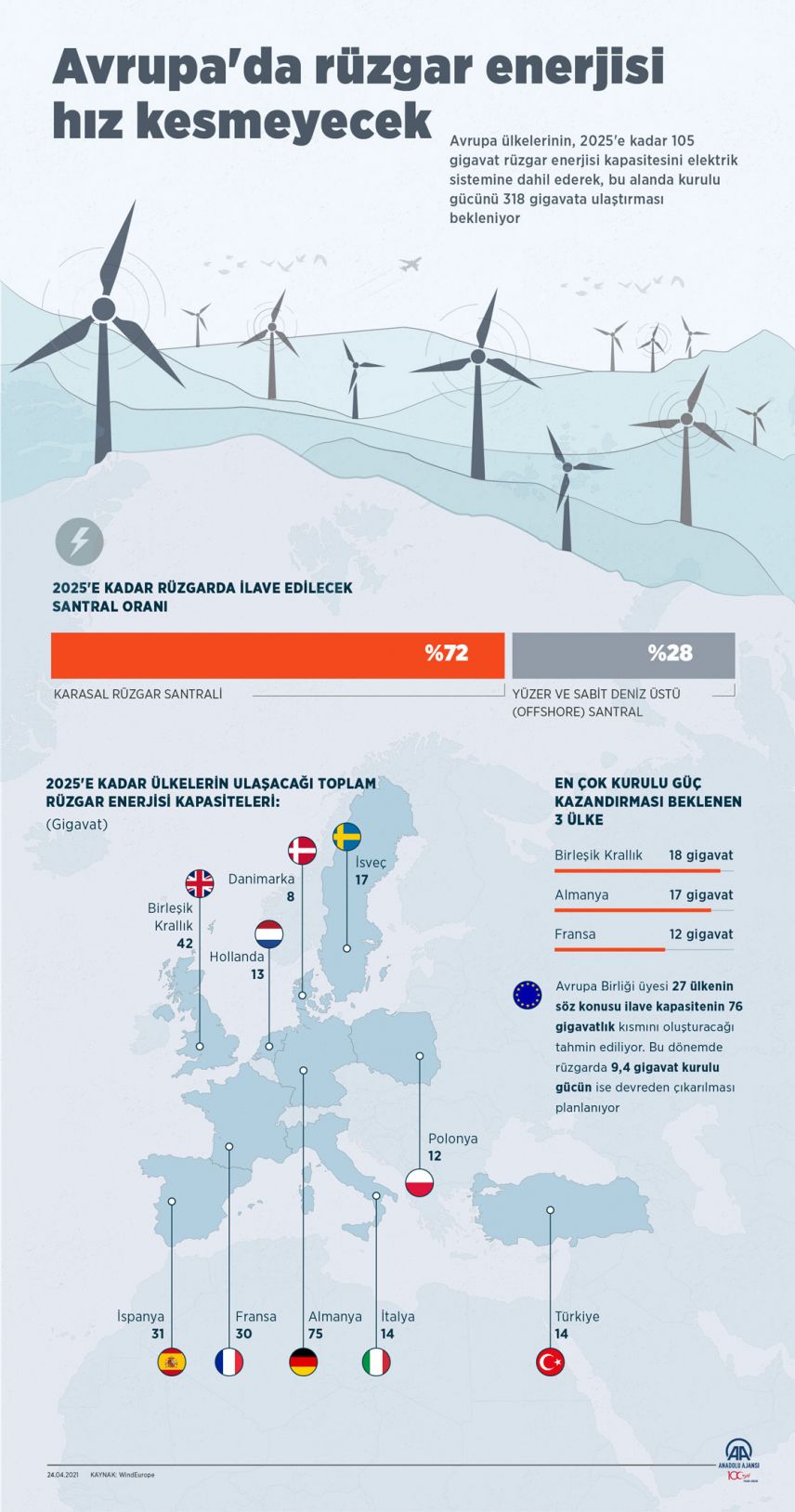 Avrupa ülkelerinin, 2025'e kadar 105 gigavat rüzgar enerjisi kapasitesini elektrik sistemine dahil ederek, bu alanda kurulu gücünü 318 gigavata ulaştırması bekleniyor.