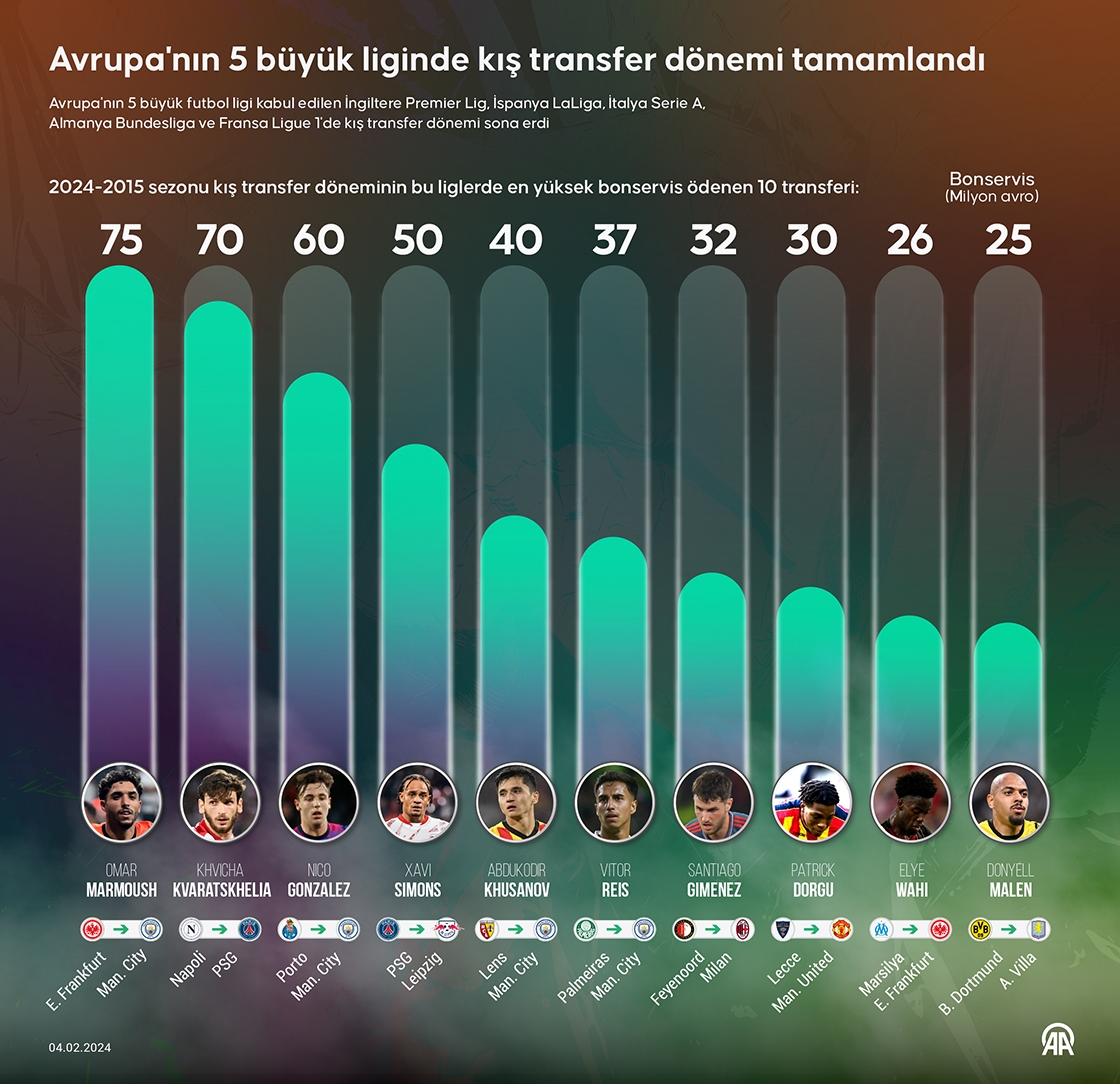 Avrupa'nın 5 büyük futbol ligi İngiltere Premier Lig, İspanya LaLiga, İtalya Serie A, Almanya Bundesliga ve Fransa Ligue 1'de kış transfer dönemi sona erdi.