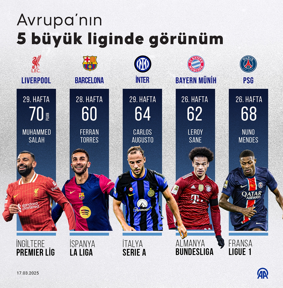Avrupa’nın beş büyük liginde zirvedeki takımlar galibiyet serisini sürdürdü, Barcelona, PSG, Liverpool, Inter ve Bayern Münih liderliklerini korudu.
