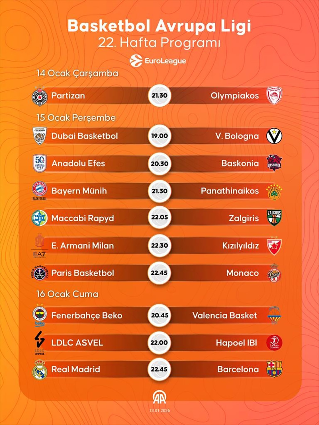 Avrupa basketbolunun kulüpler düzeyindeki bir numaralı organizasyonunda 22. hafta maçları 14, 15 ve 16 Ocak'ta oynanacak.
