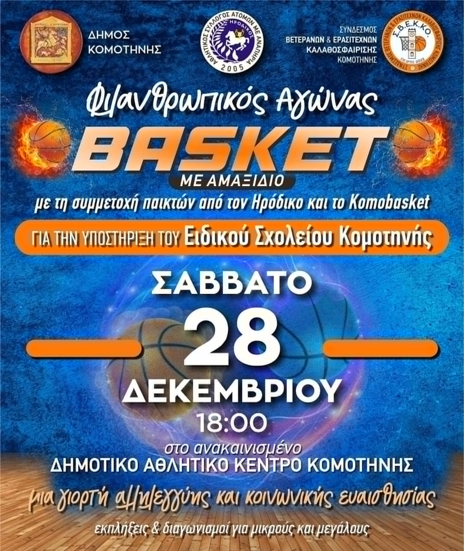 Gümülcine Belediyesi ve Gümülcine Engelliler Spor Kulübü (ΗΡΟΔΙΚΟ)'nun iş birliğinde, Gümülcine Veteranlar ve Amatör Basketbolcular Derneği'nin katılımıyla bugün (28 Aralık Cumartesi) saat 18:00'de Gümülcine Yenilenmiş Belediye Spor Merkezi’nde (ΔΑΚ)'ta yardım amaçlı bir basketbol maçı düzenlenecek.