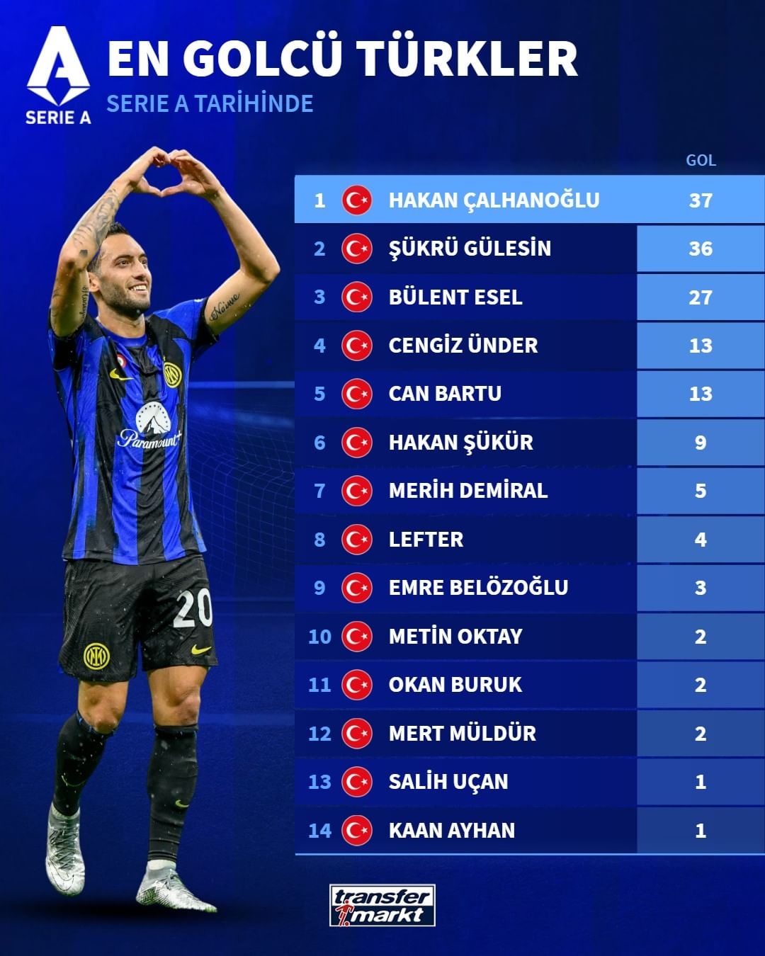 Milli futbolcu Hakan Çalhanoğlu, İtalya Birinci Futbol Ligi'nde (Serie A) en fazla gol atan Türk futbolcu ünvanını ele geçirdi.