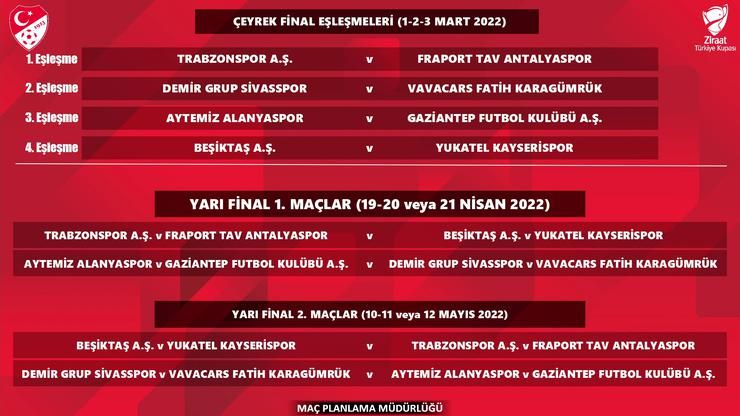 Ziraat Türkiye Kupası'nda çeyrek ve yarı final eşleşmeleri belli oldu. Dört büyüklerden kupada yoluna devam edenTrabzonspor'un rakibi Fraport TAV Antalyaspor olurken, Beşiktaş'ın rakibi ise Yukatel Kayseri oldu.