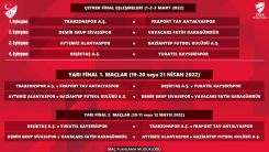 Kupada tek maç eleme usulüne göre oynanacak çeyrek final müsabakaları sonucunda tur atlayan takımlar, çift maç eleme usulüne göre yapılacak yarı finalde mücadele edecek.
