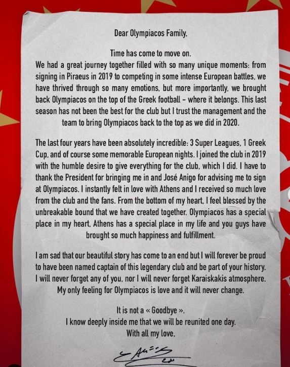 Olympiakos forması giyen Fransız futbolcu Mathieu Valbuena, sözleşmesi sona ermesi nedeniyle takıma ve taraftarlara veda etti.