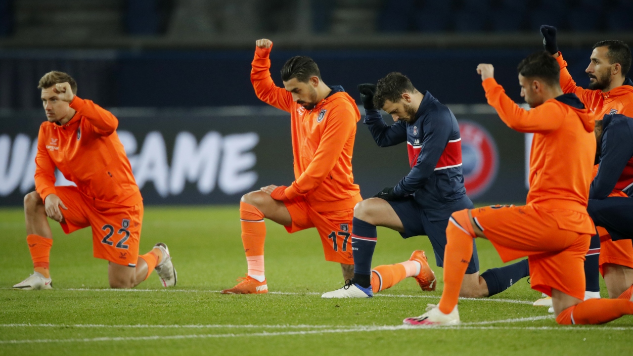 PSG-Başakşehir maçı öncesinde hakemler ve futbolcular orta sahada diz çökerek Şampiyonlar Ligi müziği eşliğinde ırkçılığı protesto etti. UEFA Şampiyonlar Ligi H