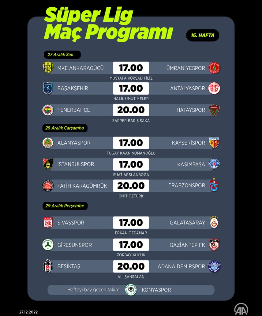 Süper Lig'de 16. hafta mücadelesi 27 Aralık Salı günü oynanacak üç maçla başlayacak. (Grafik: Kemal Delikmen/AA)
