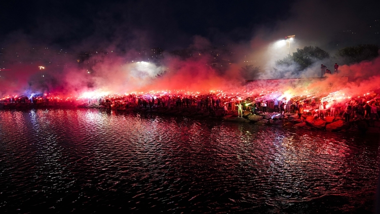 Alanda kurulan sahne ve çevresinde müzik eşliğinde yöresel oyunlar oynanırken, taraftarlar bayraklar ve meşaleler eşliğinde takımları lehine tezahüratlarda bulundu.