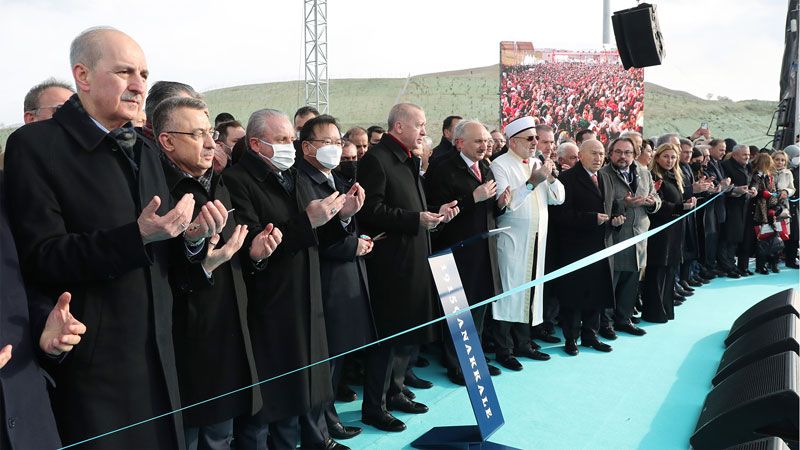 "Ne diyor şair? 'Sen ki asara gömülsen taşacaksın/ Heyhat, sana gelmez bu ufuklar, seni almaz bu cihat/ Ey şehit oğlu şehit, isteme benden makber/ Sana aguşunu açmış duruyor Peygamber.' Evet, biz de Peygamber yoldaşı şehitlerimize layık olabilmek için çalışıyoruz, mücadele ediyoruz. Şehitlerimizin aziz hatıralarına, ecdadın 107 yıl önce kazandığı muhteşem zafere adadığımız 1915 Çanakkale Köprüsü'nü bir hilal uğruna ya Rab, batan güneşlere, bedrin aslanları kadar şanlı, tarihe gömülemeyecek kadar büyük ecdada ithaf ediyoruz. Hani hep maziden atiye köprü kurmak diyoruz ya işte bugün bu sözü hem lafzıyla hem ruhuyla hayata geçiriyoruz."