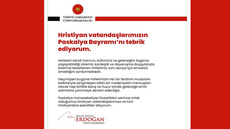 Türkiye Cumhurbaşkanı Recep Tayyip Erdoğan, Paskalya Bayramı nedeniyle bir mesaj yayımladı.