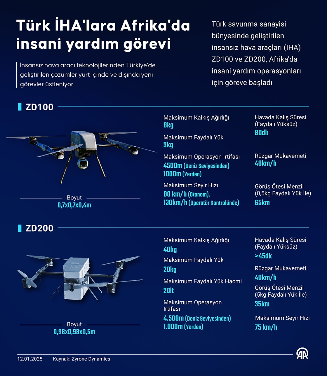 Türk savunma sanayisi bünyesinde geliştirilen insansız hava araçları (İHA) ZD100 ve ZD200, Afrika'da insani yardım operasyonları için göreve başladı.
