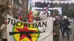 Terör örgütünü simgeleyen paçavralar taşıyan grupla polis arasında çıkan arbedede 4 polis hafif yaralandı. 4 protestocuyu gözaltına alan polis, göstericileri dağıttı.