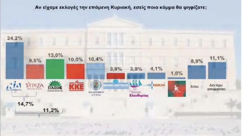 Ankete göre, "Gelecek pazar seçim olsa hangi partiye oy verirsiniz?" sorusuna verilen cevaplarda ND, %24,2 oy oranı ile 11,2 puan farkla birinci sırada yer alıyor, ancak oy kaybı yaşadığı belirtiliyor.