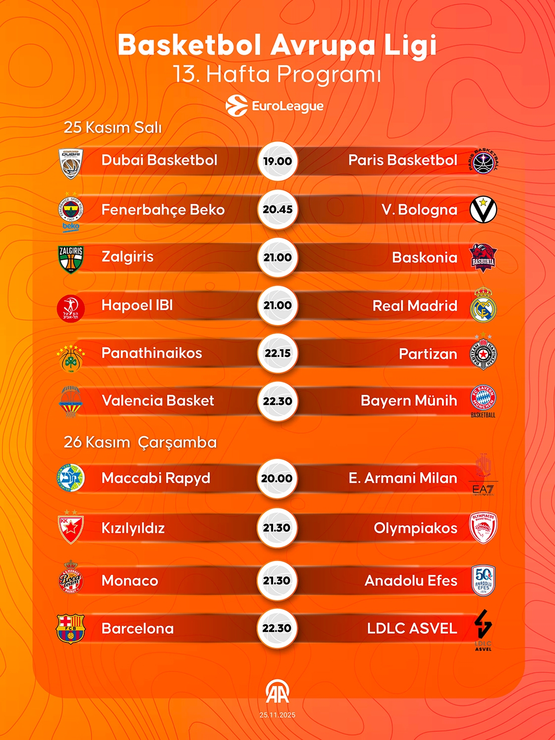 Avrupa basketbolunun kulüpler düzeyindeki bir numaralı organizasyonunda 13. hafta maçları 25 ve 26 Kasım'da oynanacak.
