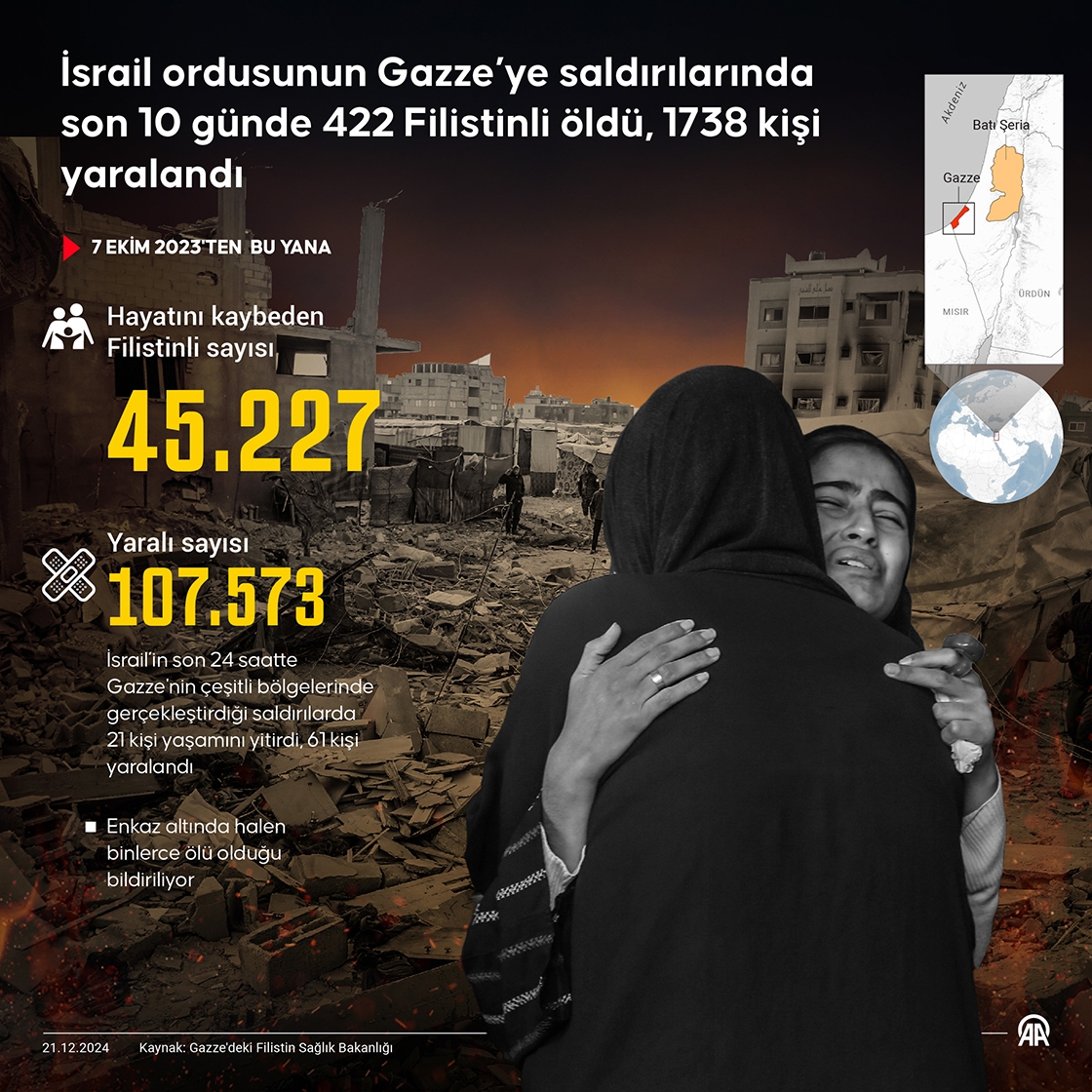 İsrail ordusu Gazze’de katliama devam ediyor. Son 10 günde düzenlenen saldırılarda 422 Filistinli öldü, 1738 kişi yaralandı.