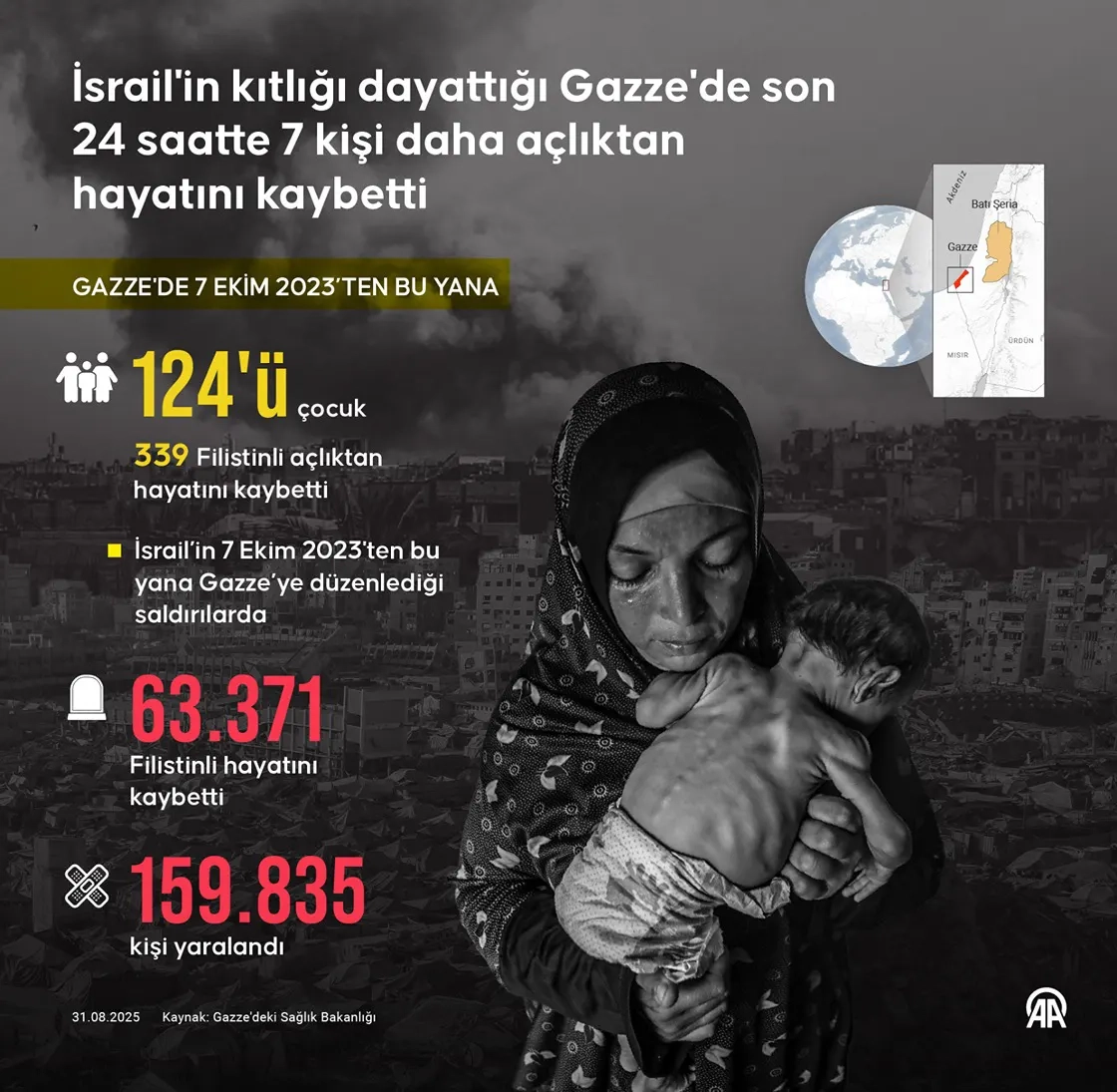 Gazze'de 7 Ekim 2023'ten beri açlık ve yetersiz beslenme nedeniyle yaşamını yitirenlerin sayısı 124'ü çocuk olmak üzere 339'a yükseldi.