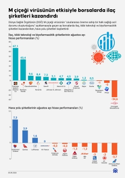 Dünya Sağlık Örgütünün (DSÖ) M çiçeği virüsünün 'uluslararası öneme sahip bir halk sağlığı acil durumu oluşturduğunu' açıklamasıyla geçen ay borsalarda ilaç, tıbbi teknoloji ve biyofarmasötik şirketleri kazandırırken, hava yolu şirketleri kaybettirdi. Grafik: Murat Usubali/AA)