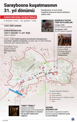 Tarihin en uzun süren kuşatmalarından birisini yaşayan Saraybosna'da 1601'i çocuk toplam 11 bin 541 kişinin hayatını kaybetti, kente günde ortalama 329 havan topu düştü.