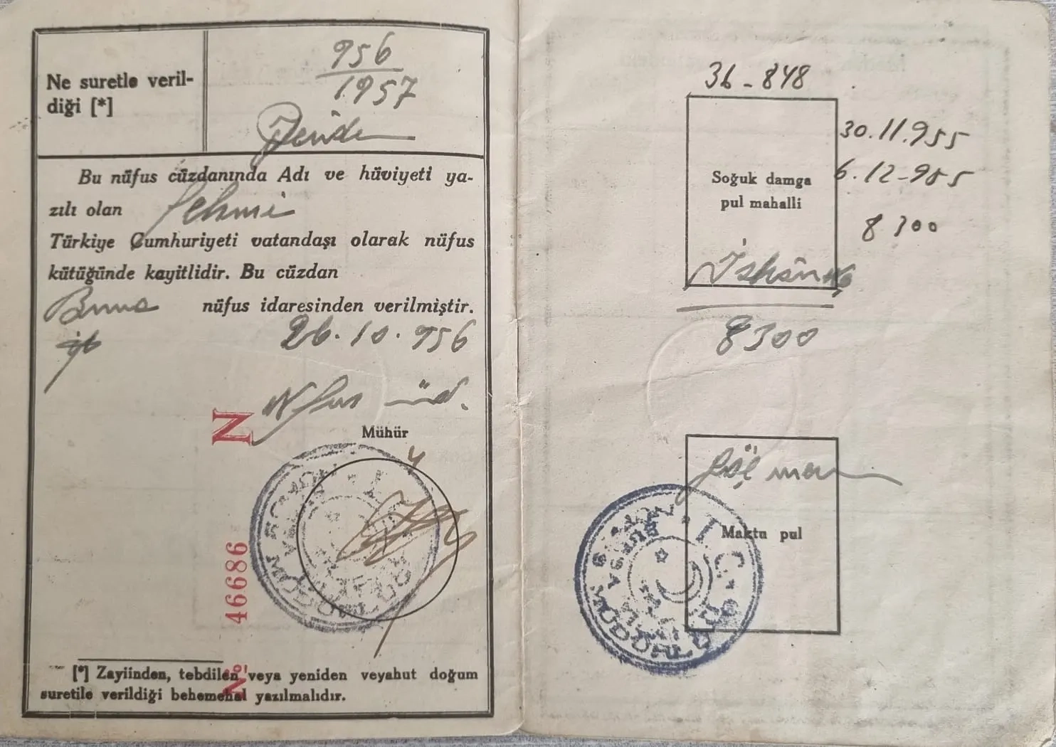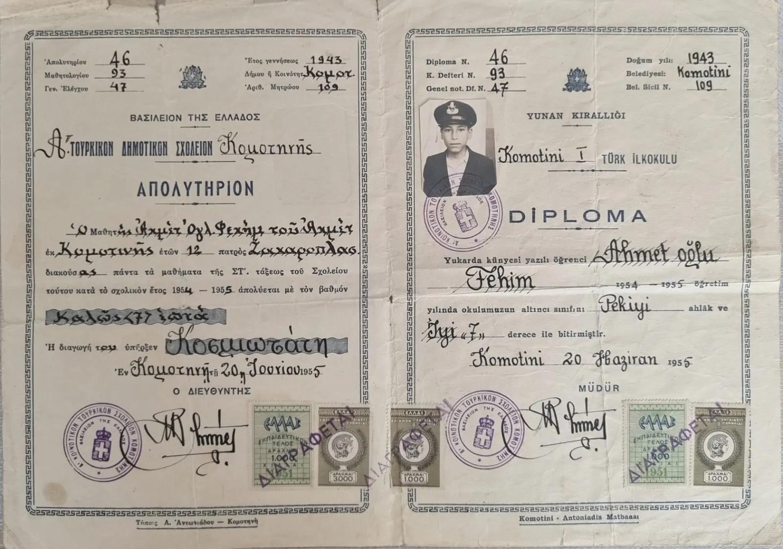 Prof. Dr. Vedat Çalışkan’ın babası Fehim Ahmetoğlu adına 1955’te tanzim edilen ilkokul diploması