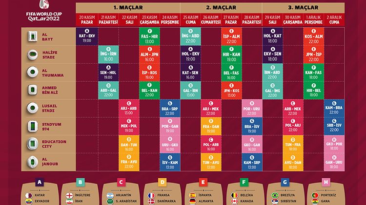 İlk kez Arap dünyasından bir ülkede düzenlenecek turnuva, 64 müsabakaya sahne olacak. Beş kentte yer alan 8 stadın ev sahipliği yapacağı 2022 Dünya Kupası'nda takımlar, dörderli 8 grupta mücadele edecek.