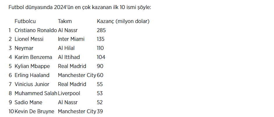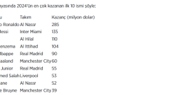 Suudi Arabistan'dan 4 oyuncu, 2024'ün en çok kazanan 10 futbolcusu arasına girdi. İngiltere'den 3, İspanya'dan 2 ve ABD'den bir futbolcu listeye dahil oldu.