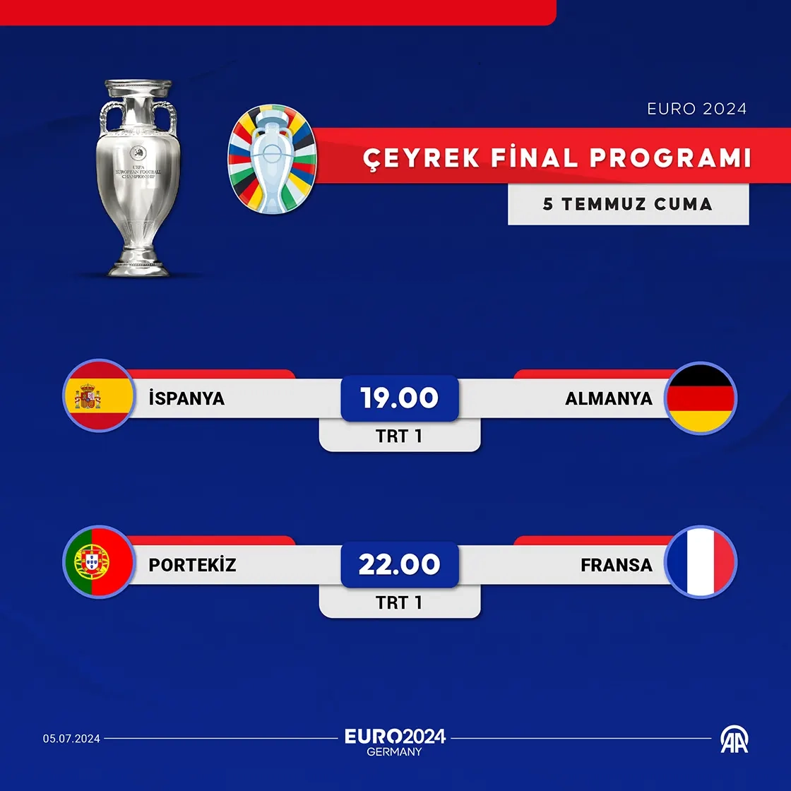 Euro 2024 Avrupa Futbol Şampiyonası çeyrek final maçlarında 19.00'da İspanya ile Almanya, 22.00'de Portekiz ile Fransa karşı karşıya gelecek.