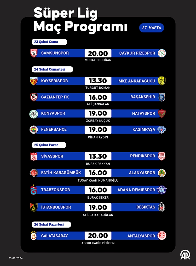Futbolda Trendyol Süper Lig'de 27, Trendyol 1. Lig'de de 24. hafta karşılaşmaları yapılacak. TFF 2. Lig'de 27, TFF 3. Lig'de ise 21. hafta maçları oynanacak.