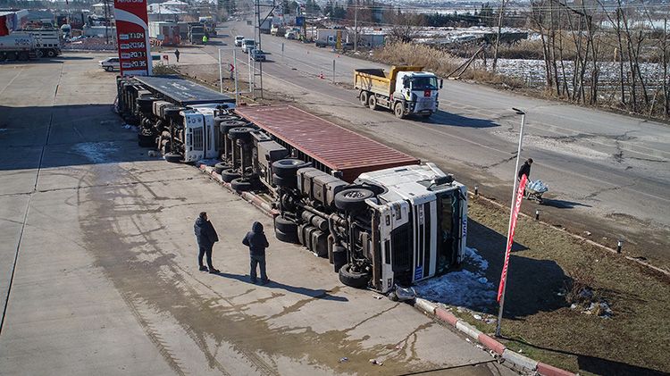 "Asrın felaketi" olarak nitelendirilen sarsıntıyla yan yatan tırlardan sürücüler, kendi çabalarıyla sağ çıkmayı başardı.