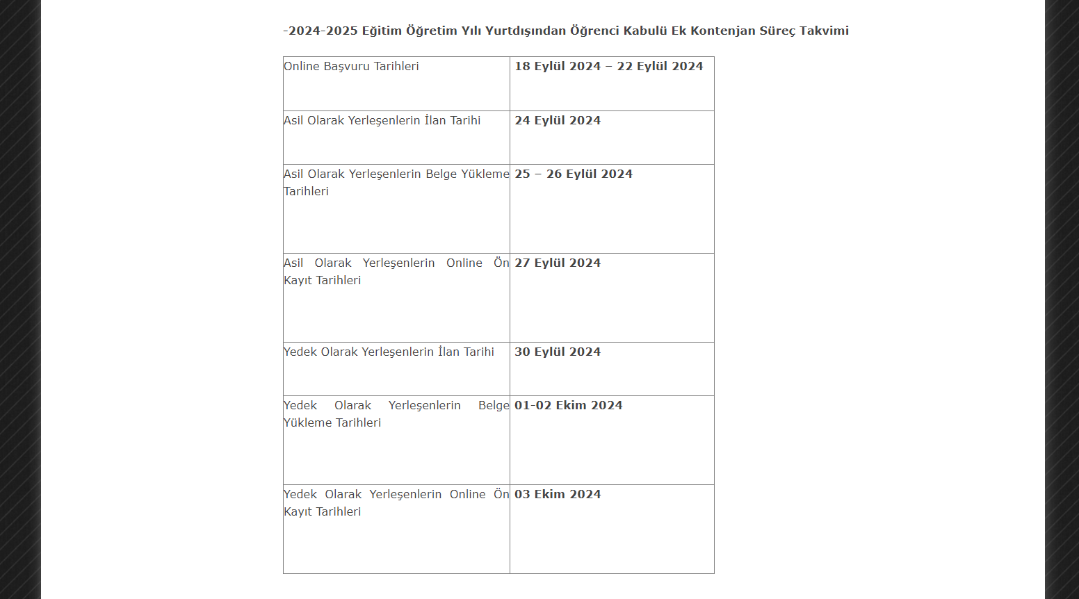 1. Ek Kontejan için başvuruda bulunacak olan öğrenciler, 2024-2025 Eğitim Öğretim Yılı Yurtdışından Öğrenci Kabulü Ek Kontenjan Süreç Takvimi, adayların dikkat etmesi gereken hususlar, adaylar tarafından başvuru sırasında sisteme yüklenmesi gereken belgeler ve başvurulara ilişkin önemli hususlara ilişkin detaylı bilgileri aşagıdaki linkten öğrenebilirler.