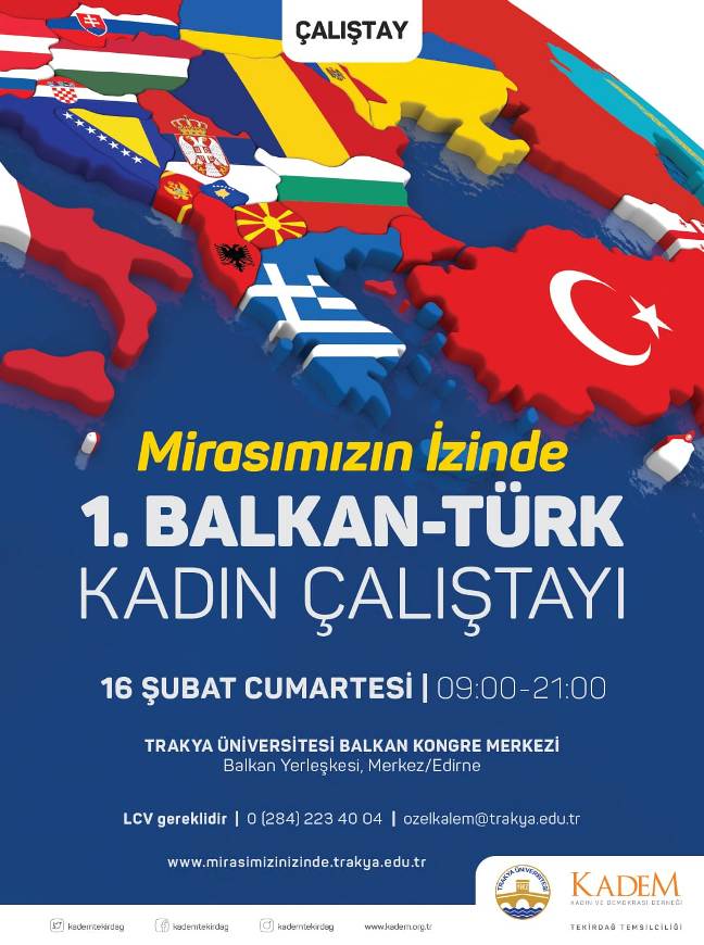 Edirne Trakya Üniversitesi, KADEM Tekirdağ Temsilciliği’nin iş birliğiyle hayata geçirilen ve Balkanlar’daki soydaş kadınların sorunlarına çözüm önerileri sunulması amaçlanan “Mirasımızın İzinde: 1. Balkan-Türk Kadın Çalıştayı” etkinliğine ev sahipliği yapacak.