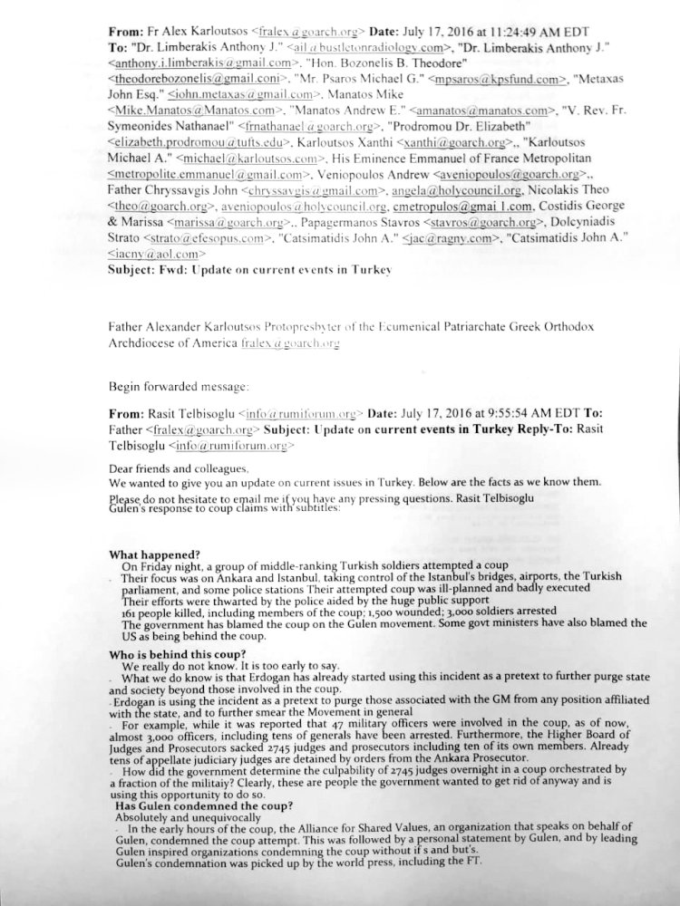 Aydınlık'ın yayımladığı yazışmaya göre Telbisoğlu, 15 Temmuz darbe girişiminin ertesi günü 16 Temmuz'da Karloutsos'a darbe girişimi hakkında “bilgi” veriyor. Darbe girişimine karşı FETÖ'ye yönelen suçlamaları aklamaya çalışan “bilgi notu”, Karloutsos tarafından diğer önde gelen din adamlarına yönlendiriliyor. Bilgi notunda darbenin bastırıldığı, ancak bu girişimin arkasında “Gülen hareketinin” olmadığını iddia ediliyor ve Erdoğan'ın, Gülen'i “günah keçisi” ilan ederek darbe girişimi bahanesiyle “cadı avı” başlattığı ileri sürülüyor.