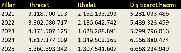 İki ülke arasındaki dış ticaret hacmi, 2021'de 5,3 milyar dolar olarak kayıtlara geçerken, bu tutar 2022'de 5,5 milyar dolar, 2023'te 5,8 milyar dolar ve 2024'te 6,2 milyar dolara yükseldi. Dış ticaret hacmindeki artış, 2025'te de devam etti. Bu çerçevede dış ticaret hacmi, geçen yıl 6,7 milyar dolara ulaştı ve böylece 10 milyar dolar hedefine biraz daha yaklaşıldı. Türkiye söz konusu ülkeye karşı ihracatçı konumunu koruyarak, 2025'te yaklaşık 4,1 milyar dolar dış ticaret fazlası verdi.