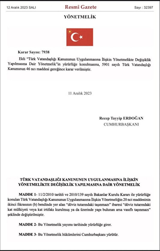 Daha önce "En az 400 bin Amerikan Doları veya karşılığı Döviz tutarındaki taşınmaz" ifadesi ile belirlenen şart, "400 bin dolar tutarındaki kat mülkiyeti veya kat irtifakı kurulmuş ya da üzerinde yapı bulunan arsa vasıflı taşınmaz" şeklinde güncellendi.