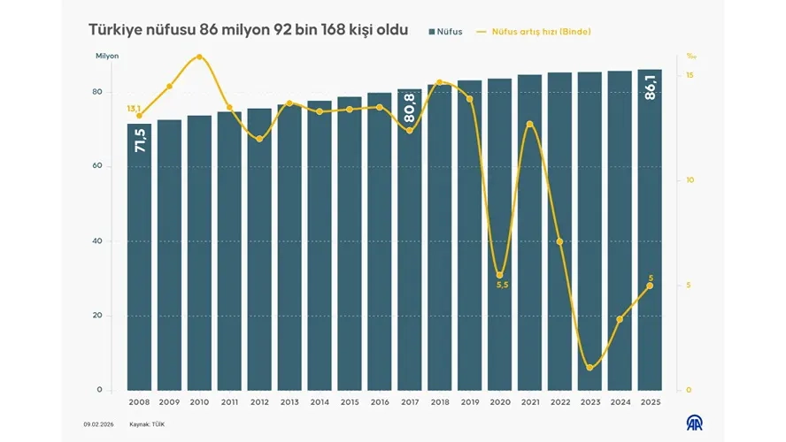 Yıllık nüfus artış hızı 2024 yılında binde 3,4 iken, 2025 yılında binde 5 oldu.