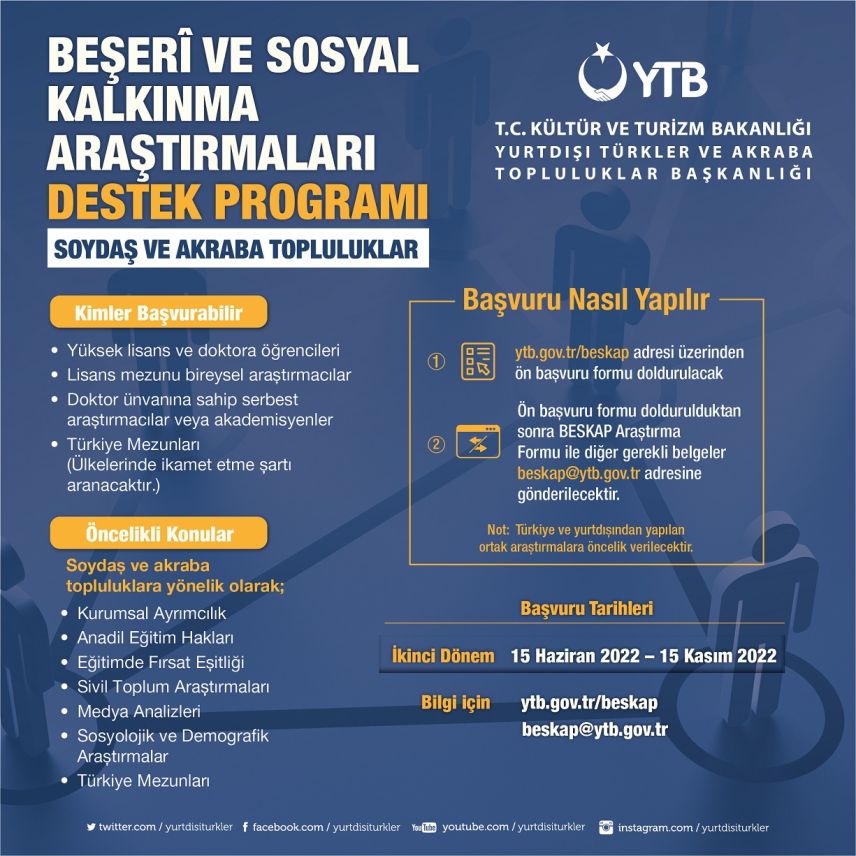 Yurtdışı Türkler ve Akraba Topluluklar Başkanlığı (YTB) tarafından; kardeş, soydaş ve akraba topluluklara yönelik kapsamlı bilimsel araştırmaların desteklenmesi amacıyla hayata geçirilen Beşeri ve Sosyal Kalkınma Araştırmaları Programı’nın (BESKAP) ikinci dönem başvuruları başladı.