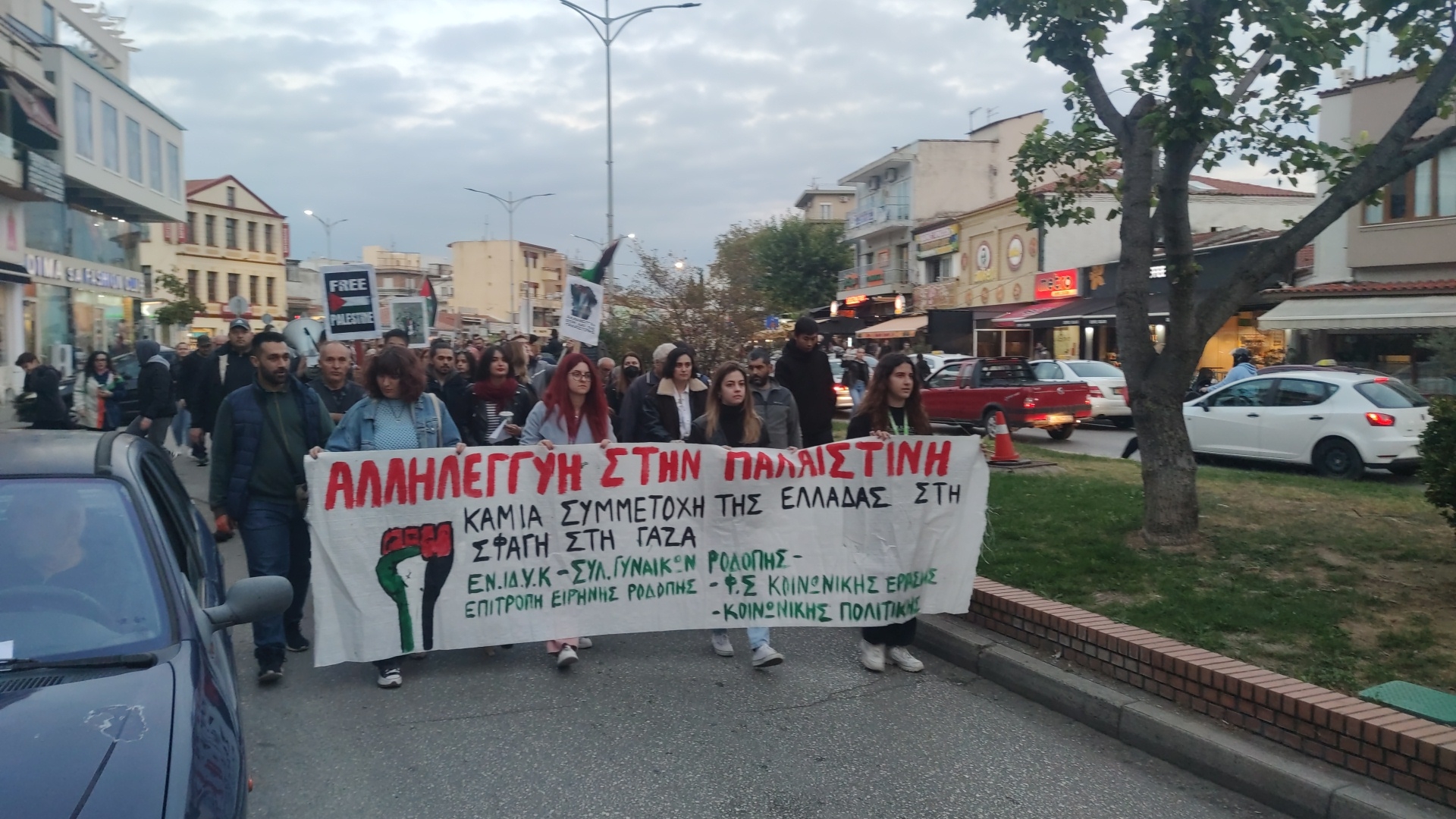 Gümülcine Özel Sektör Memurları Birliği, Rodop Barış Komisyonu, Rodop Kadınlar Derneği ve Toplumsal Hizmet Öğrencileri Derneği tarafından, zulüm altında inleyen Filistin halkına destek amacıyla bu akşam saat 18.00'da Gümülcine'de bir yürüyüş düzenlendi.