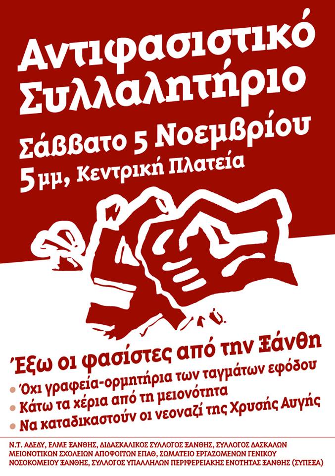 Στις 5/11/2016 o «μακελέψαμε» της Χρυσής Αυγής, Χρυσαυγίτης Βουλευτής Γιάννης Λαγός πρόκειται να εγκαινιάσει τα γραφεία της δολοφονικής οργάνωσης στην Ξάνθη τα οποία θα χρησιμοποιηθούν ως ορμητήριο για τις εγκληματικές επιθέσεις τους. Ήδη στην περιοχή οι νεοναζί της Χρυσής Αυγής έχουν να επιδείξουν σημαντικό εγκληματικό «έργο» όπως επιθέσεις σε αριστερούς φοιτητές και πολίτες και σε μουσουλμάνους της μειονότητας.