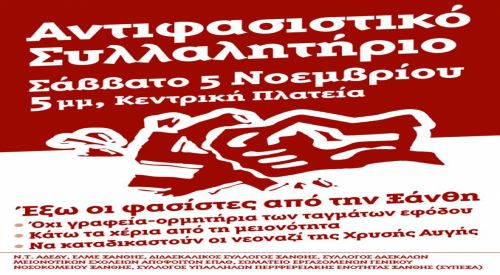 Η Διοίκηση της ΠΕΝΕΝ στηρίζει την πρωτοβουλία για το αντιφασιστικό συλλαλητήριο το Σάββατο 5/11/2016 στην κεντρική πλατεία Ξάνθης. Καλεί τα μέλη της να την πλαισιώσουν και να συμμετάσχουν σε αυτή. Ο λαός, οι εργαζόμενοι, τα συνδικάτα και η νεολαία της Ξάνθης με την μαζική παρουσία τους στο συλλαλητήριο να καταστήσουν σαφές το μήνυμα ότι οι νεοναζιστές είναι ανεπιθύμητοι στην πόλη.