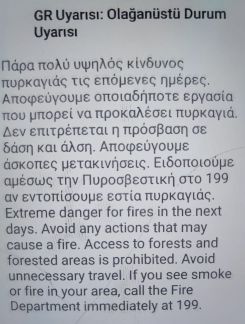 Yunanistan’ın farklı bölgelerinde çıkan yangınların kontrol altına alınamaması ve birçok yerde yerleşim bölgelerini de tehdit etmesi nedeniyle vatandaşlar cep telefonlara gönderiler mesajlarla uyarıldı.