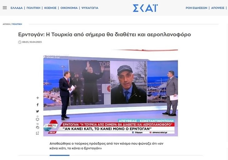SKAİ TV'ye bağlanan Manolis Kostidis, Başkan Erdoğan'ın sözlerini iletti "Türkiye bugünden itibaren kendi uçak gemisine sahip olacak" ifadelerini kullandı. TCG Anadolu'nun insansız hava araçları taarruz helikopterleri, tanklar, zırhlı amfibi araçlar taşıyacağı vurgulandı.
