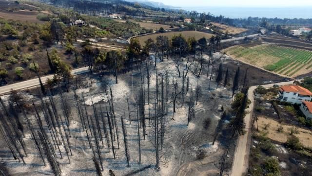Adadaki çam ormanlarının bulunduğu turistik Rovies kasabasında, yeşil alanlar küle dönerken bir çok canlı da telef oldu. Yangınlar bölgede hem ekolojik hem de ekonomik bir felakete yol açtı. Yangın nedeniyle bir çok noktada trafik akışının durdurulduğu belirtildi.