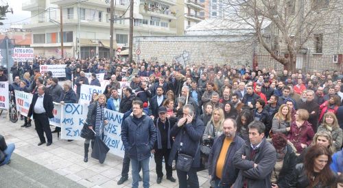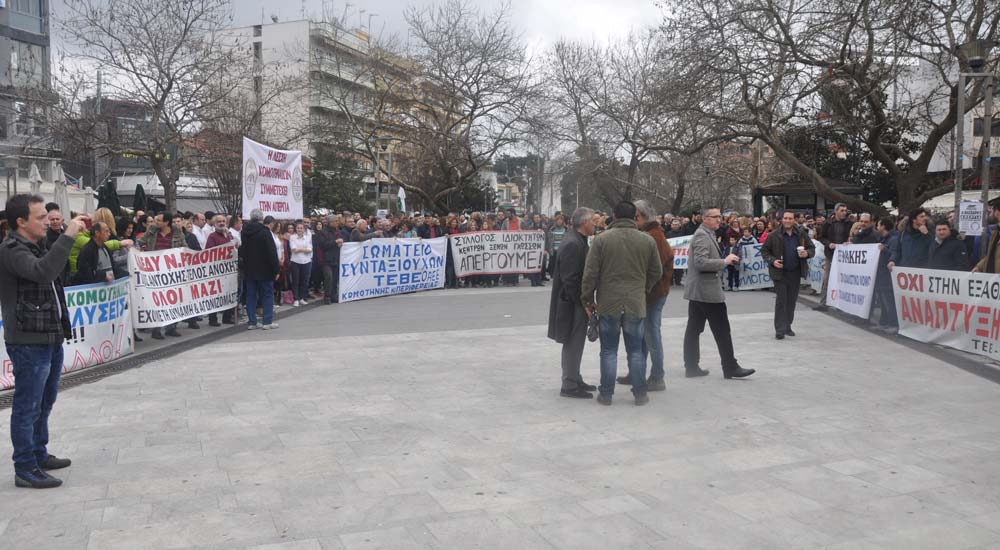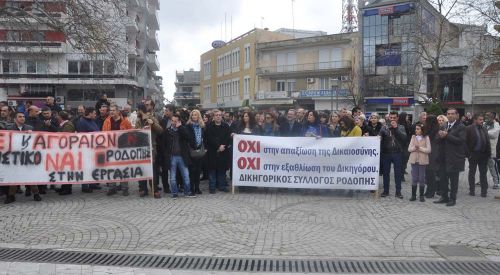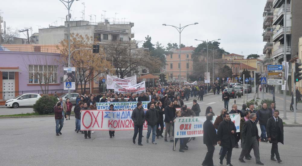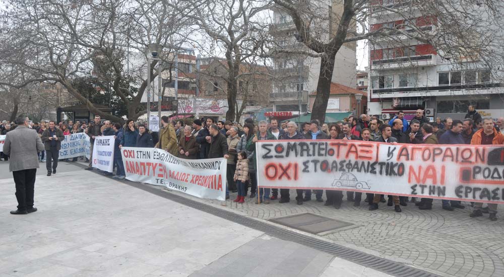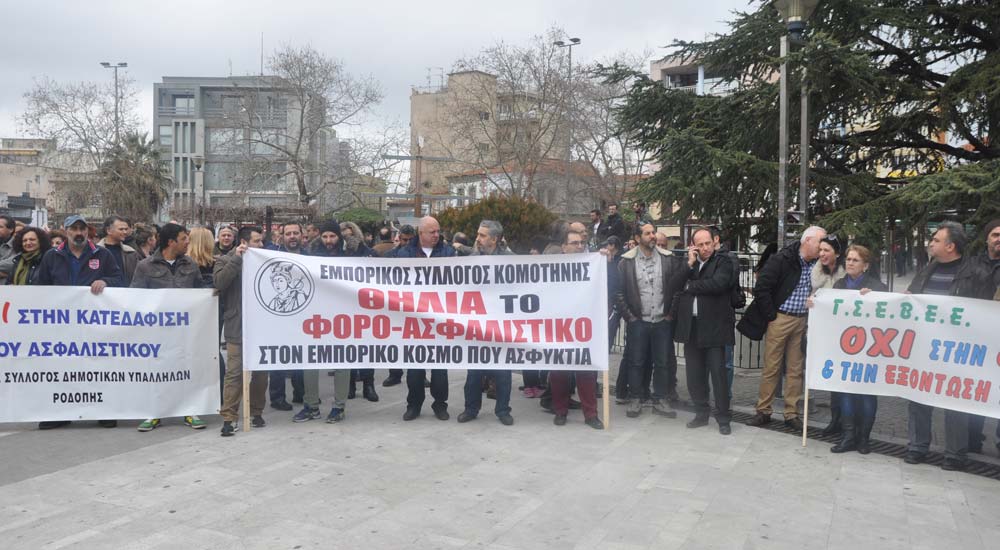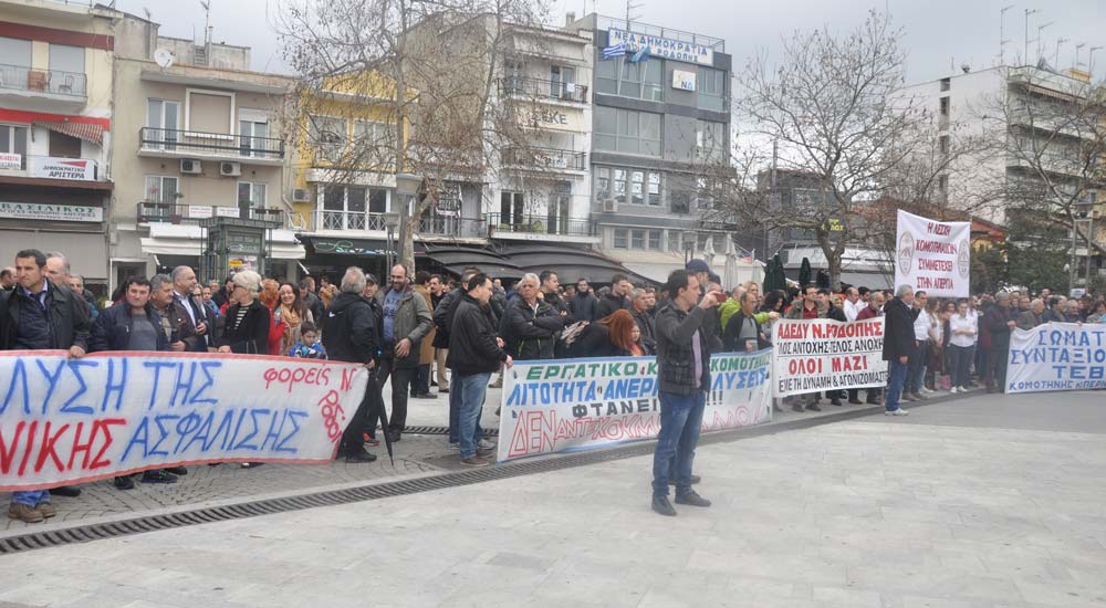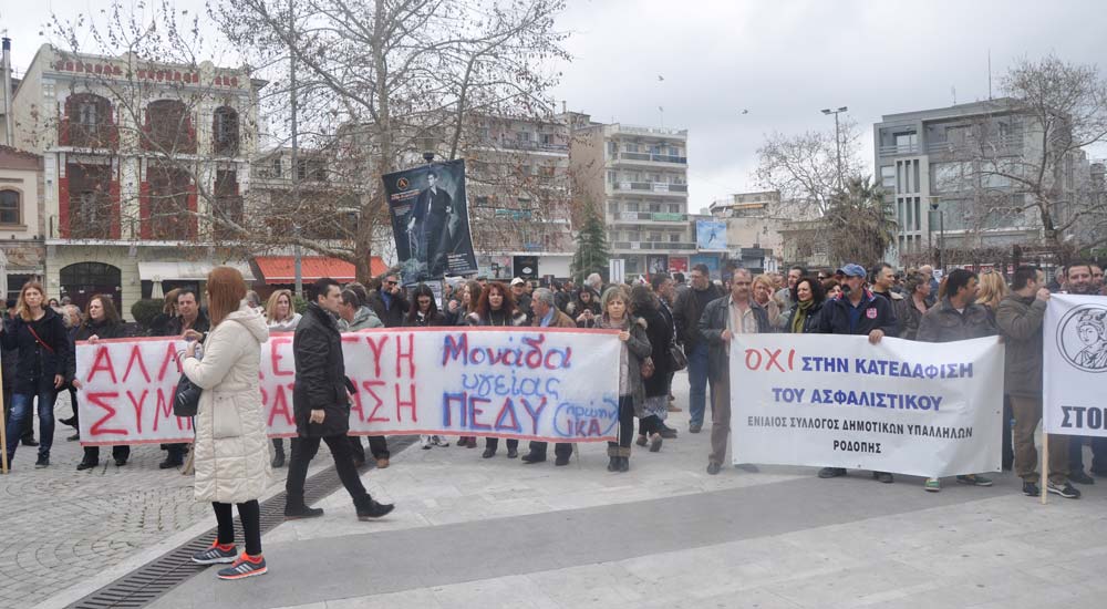 Rodop ilinde Rodop Kamu Çalışanları Sendikası (ADEDY N. RODOPİS)’nin organize ettiği greve destek veren vatandaşlar Rodop Çalışma Merkezi önünde toplandıktan sonra başladı. Sendika ve dernek temsilcileri konuşma yaptılar. Yasa tasarısının doğuracağı zorluklardan bahsettiler, tasarının geri çekilmesini istediler.