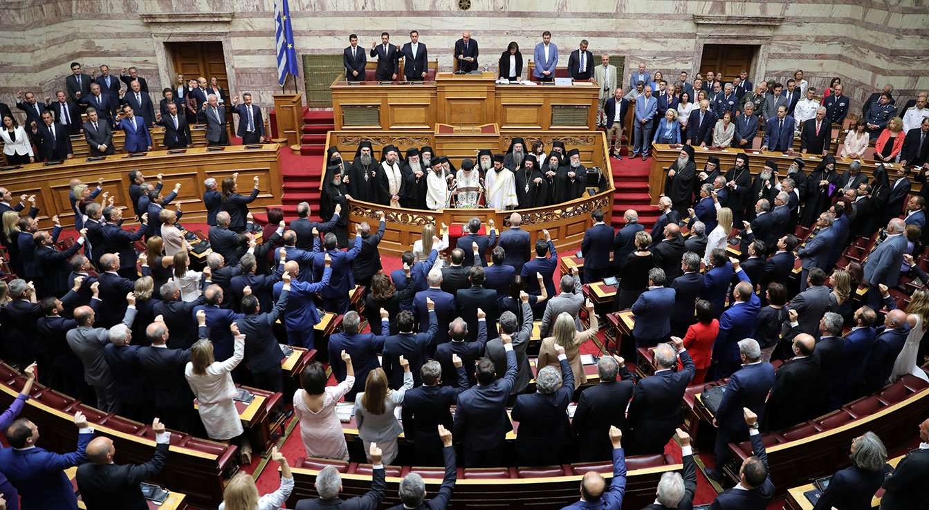 Meclis'te ilk olarak Atina Başpiskoposu İeronimos'un yönettiği dini ayin gerçekleştirildi. Daha sonra milletvekillerinin tercihlerine göre siyasi, Ortodoks Hristiyan ya da İslami yemin töreni yapıldı.