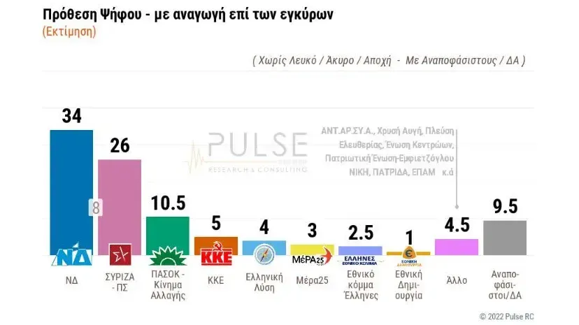 Pulse kamuoyu araştırma şirketinin SKAİ televizyonu için yaptığı araştırma sonuçlarına göre iktidardaki Yeni Demokrasi Partisi, anamuhalefet partisi SYRIZA’nın 8 puan önünde bulunduğunu ortaya koydu.