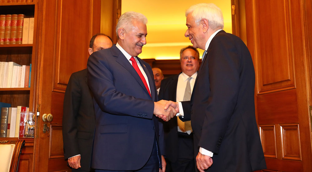 T.C. Başbakanı Binali Yıldırım, Atina temasları kapsamında Yunanistan Başbakanı Aleksis Çipras ile Başbakanlık binasında görüşmesinin ardından, aynı bölgede bulunan Cumhurbaşkanlığı Sarayı'na yürüyerek geçti. Burada, Yunanistan Cumhurbaşkanı Prokopis Pavlopoulos ile bir araya gelen Yıldırım, görüşme öncesi yaptığı konuşmada, Cumhurbaşkanı Recep Tayyip Erdoğan'ın selamlarını iletti.
