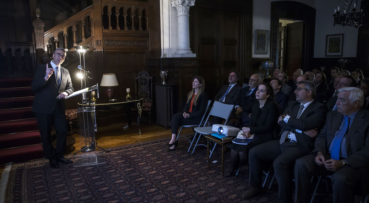 Atina Büyükelçiliği'nde gerçekleştirilen programda, Büyükelçi Özügergin 30'u aşkın üst düzey yöneticiye Türkiye ekonomisinin gelişimi ve son durumunun yanı sıra iş potansiyeline ilişkin brifing verdi. Özügergin daha sonra, yöneticilerin ekonomi, siyaset ve iki ülke ilişkileri hakkındaki sorularını yanıtladı.