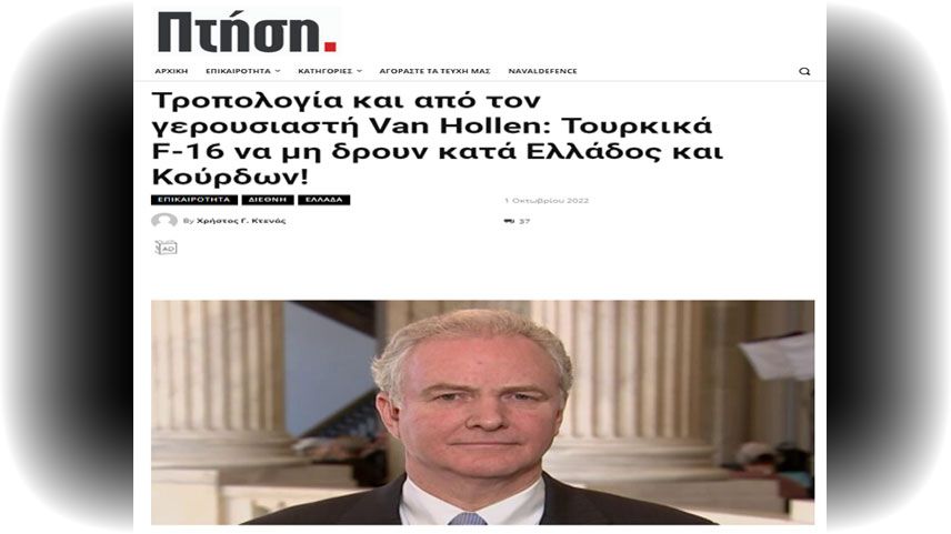 Yunanistan yanlısı ABD'li Senatör Chris van Hollen, 2023 Yılı ABD Savunma Bakanlığı Bütçesi'nde, F-16'ların Türkiye'ye satışı konusunda "Yunanistan hava sahasında kullanılmaması" şartına "PKK/YPG'ye karşı da kullanılmaması" maddesi eklenmesi gerektiğini söyledi.