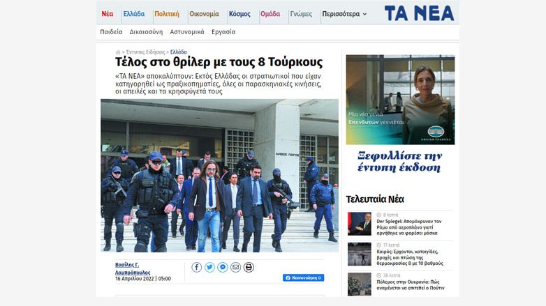 Yunanistan´ın en saygın gazetelerinden biri olan Ta Nea’nın manşetinde yer alan haberde, 2016 yılındaki darbe girişiminin ardından helikopterle Yunanistan’a kaçan Fetullahçı Terör Örgütü (FETÖ) üyesi 8 kişi, Yunanistan’dan ayrıldı.