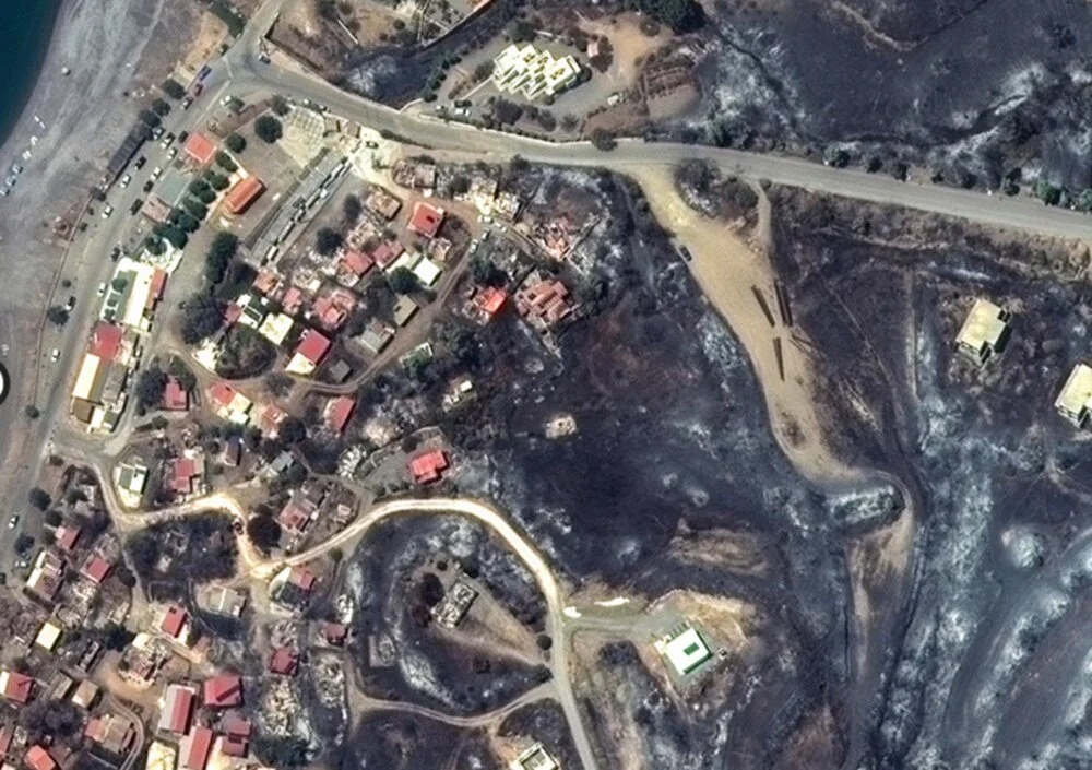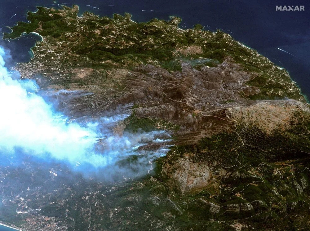 Yunanistan'da hava sıcaklıklarının bugün 44 dereceye çıkması beklenirken, ülkede 500'den fazla orman yangını ile mücadele devam ediyor. ABD'li uydu şirketi Maxar, Rodos ce Korfu adalarında süren yangınların verdiği hasarı çarpıcı bir şekilde ortaya koyan uydu görüntüleri paylaştı. Fotoğraflarda sahil kasabası Kiotari'nin neredeyse haritadan silindiği ve Rodos'ta büyük bir alanın küle döndüğü görüldü.